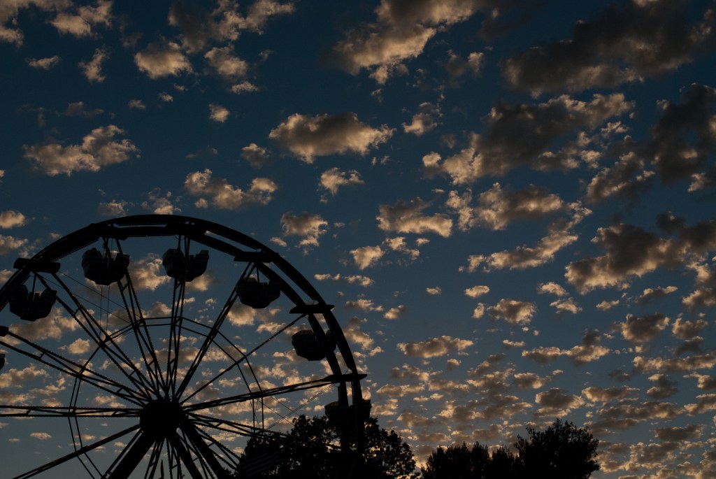 Their seat spun to the top of the wheel. Twilight was deepening to night and the fairgoers fluttered moth-like toward game booths and rides and other sources of light, seeking comfort where they were too dull-witted to feel power. Azar felt it though: the heat of the lights, of the people, of the fading day, rising up like pleasing sacrificial offerings. “Seems to me like you could do that better in a real city.”