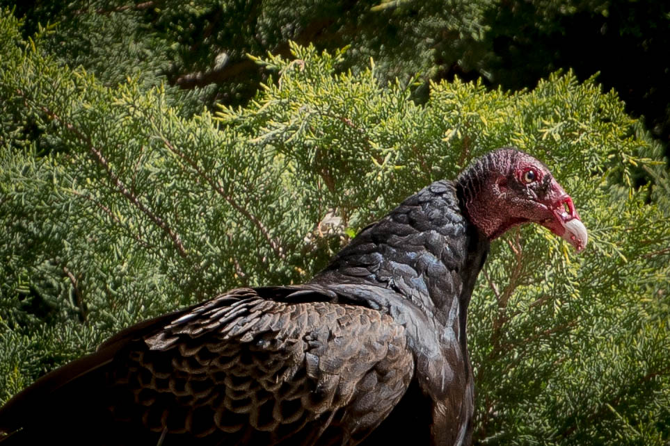 The first time I heard a turkey vulture it was twilight in Big Sur. The silence of the late afternoon forest was interrupted by a crashing so loud and abrupt that I looked around nervously expecting to see a tree toppling toward me. There was certainly a great deal of agitation in the treetops. Then a vulture – its featherless head identifying it beyond dispute – tumbled out of the uppermost branches. It flapped awkwardly in the confined space, found some small bit of lift, turned a tight circle and flew straight at the same tree – feet forward, extended wings slapping against redwood needles.