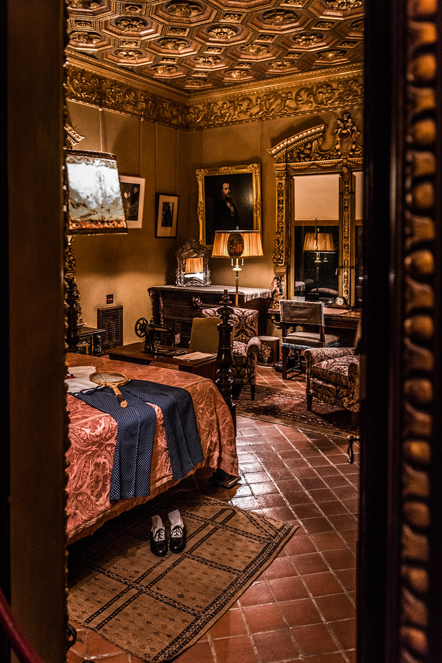 We were permitted to mill about in a courtyard overlooking the empty Neptune pool for a while to enjoy the twilight. A trickle of silent men and women in fedoras and furs with accenting canes and pearls threaded through the crowd and vanished up stairs and along paths. The pace of the tour picked up dramatically once we stepped inside, with guides at the front and rear to make sure no one tarried. We managed a handful of photos, virtually always accompanied by glares, or admonitions to hurry along. If we were guests, I increasingly felt, we were the trampish sort: handed a small container of soup and a crust of bread and – if we were fortunate – perhaps a pair of the master’s old pants, then herded out onto the streets again.