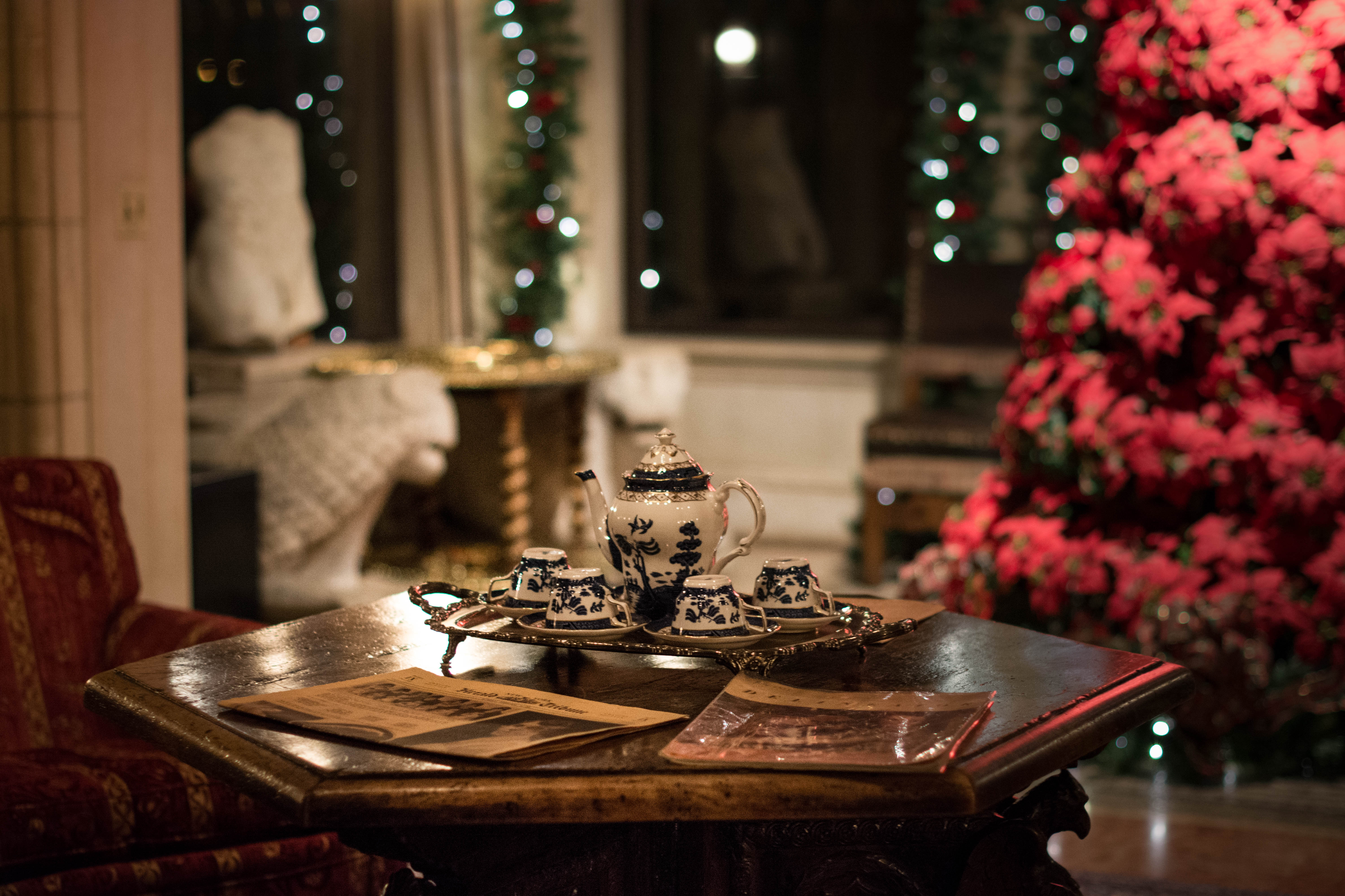 And the things I enjoyed were even smaller. I could have spent most of the night in the kitchen, with its plain ceramic bowls and simple utensils. Or in the sitting room with the tea set that was only a little ornate, and the Christmas “tree” made from potted poinsettias which, even if perhaps an excessive profusion of poinsettias, at least wasn’t garish. Those felt like the places where life was being lived.